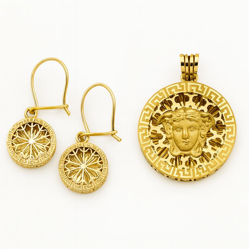 **نیم ست ورساچ: زیبایی و قدرت** این نیم ست طلایی شامل گوشوارههای شیک و یک آویز منحصربهفرد است که از طلای زرد خالص ساخته شده است. طراحی پیچیده و هنرهای ظریف این زیورآلات، آنها را در زمره اکسسوریهای خاص و جذاب قرار داده است. گوشوارهها با طرح گرد و جزئیات ظریف خود، به زیبایی صورت کمک میکنند و آویز بزرگتر با نمایی هنرمندانه از چهرهای تاریخی، جلوهای لوکس به این مجموعه میبخشد. وزن تقریبی این نیم ست 5.600 گرم بوده و با کیفیت بالا و دقت ساخته شده است. این مجموعه انتخابی ایدهآل برای بانوانی است که به دنبال زیورآلات متمایز و شیک هستند.