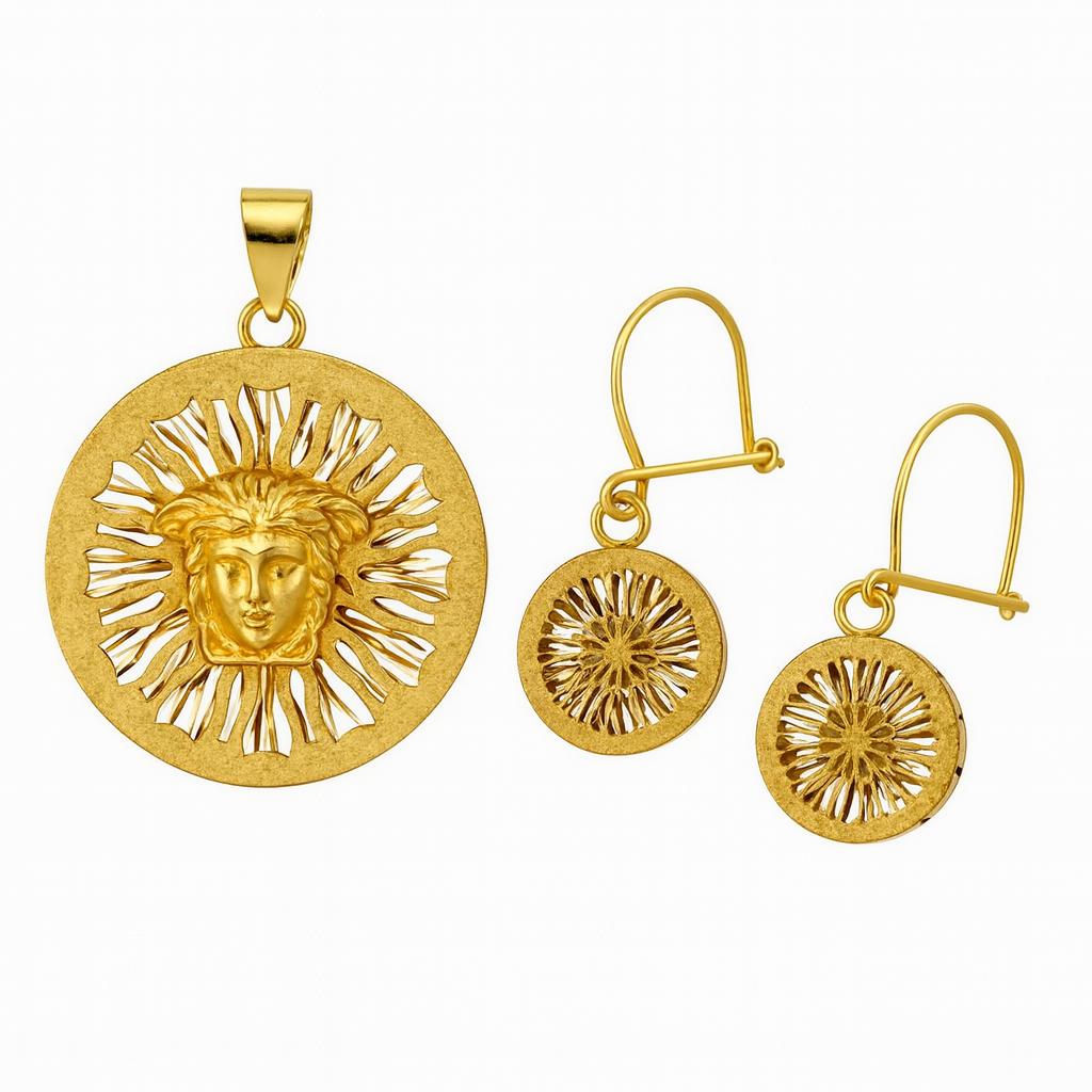### نیم ست ورساچ - جلوهای از شکوه و هنر نیم ست ورساچ، با طراحی خاص و چشمنواز، گزینهای مناسب برای عاشقان زیبایی و خاص بودن است. این مجموعه شامل یک آویز و دو گوشواره با طراحی دایرهای و منحصر به فرد است که با تمثیلهای الهام گرفته از هنر کلاسیک تزئین شده است. جنس این زیورآلات از طلای زرد با کیفیت بالا ساخته شده و به وضوح درخشش و زیبایی را به نمایش میگذارد. جزئیات طرح به همراه نقشهای ظریف بر روی سطح، به این نیم ست حالتی مدرن و شیک بخشیده است، که به راحتی میتوان آن را با هر لباسی ست کرد. وزن تقریبی 5.710 گرم و مزد ساخت 15.000% تومان، این محصول را به انتخابی ارزنده و ماندگار در دنیای طلا و جواهر تبدیل میکند.