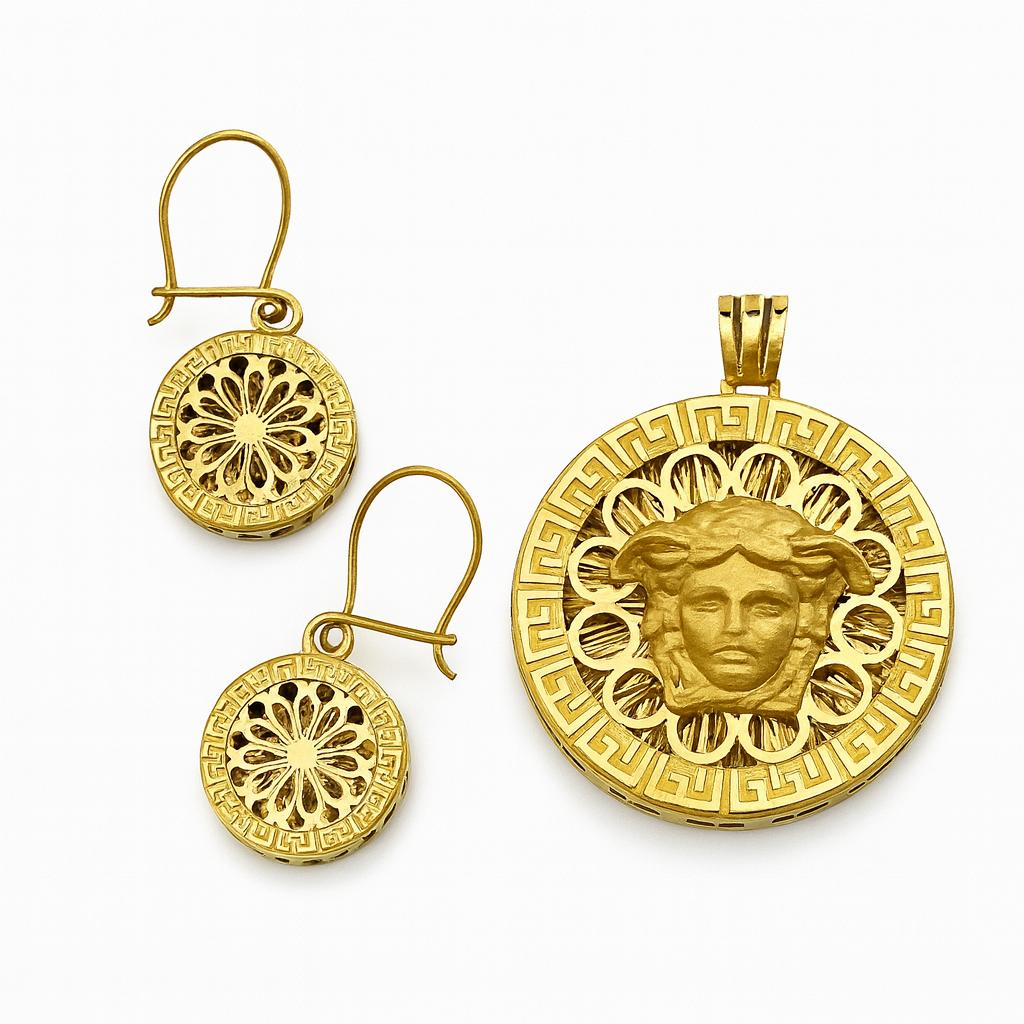 ### نیم ست شیک ورساچ این نیم ست زیبا شامل گوشواره و آویز طلا است که زیبایی و شکوه را به ارمغان میآورد. طراحی بینظیر و هنرمندانه این قطعه، ترکیبی از ابهت و ظرافت را به نمایش میگذارد. از طلای زرد با وزن تقریبی 5.560 گرم ساخته شده و از جزئیات دقیق همچون نقش برجسته صورت و الگوهای هندسی برخوردار است. گوشوارهها با طراحی تأثیرگذار و آویزهای بزرگ، جذابیت بیشتری به این مجموعه میبخشند. این نیم ست انتخابی مناسب برای مجالس رسمی و روزمره بوده و به شما جلوهای خاص و شیک خواهد داد.