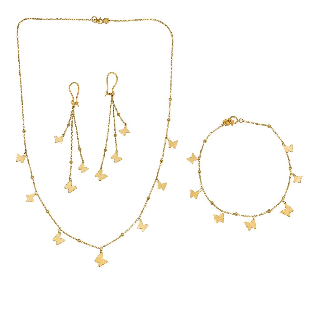 ### نیم ست پروانه شیک نیم ست پروانه، ترکیبی از ظرافت و سادگی است که زیبایی را به هر استایل شما اضافه میکند. این مجموعه شامل یک گردنبند، دستبند و گوشوارههای آویز میباشد که از طلاي زرد خالص تهیه شده است. طراحی منحصر به فرد این زیورآلات با شکلهای ظریف پروانه، حس لطافت و شگفتی را به افراد منتقل میکند. وزن تقریبی این نیم ست 7.950 گرم است و به دلیل طراحیهای جدید و مدرنش، میتواند گزینهای عالی برای مراسمها، مهمانیها و استفاده روزمره باشد. کیفیت ساخت بالا و جزئیات دقیق در به کارگیری زنجیرها، این نیم ست را به یک انتخاب خاص و شیک برای بانوان تبدیل کرده است.