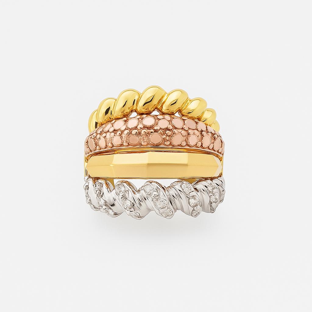 **انگشتر پورتفینو** --- این انگشتر خاص و شیک، با طراحی مدرن و جذاب خود، هر سلیقهای را به خود جلب میکند. انگشتر پورتفینو از طلای زرد، سفید و رزگلد ساخته شده و دارای سه لایه با الگوهای مختلف است؛ از پیچشهای زیبا گرفته تا سطح صاف و نگیندار. ابعاد آن به گونهای است که هم ظرافت را حفظ کرده و هم جلوهای منحصر به فرد به دست شما میبخشد. این قطعه زیبا برای استفاده روزمره یا به عنوان زیورآلات ویژه در مجالس، انتخابی ایدهآل است.