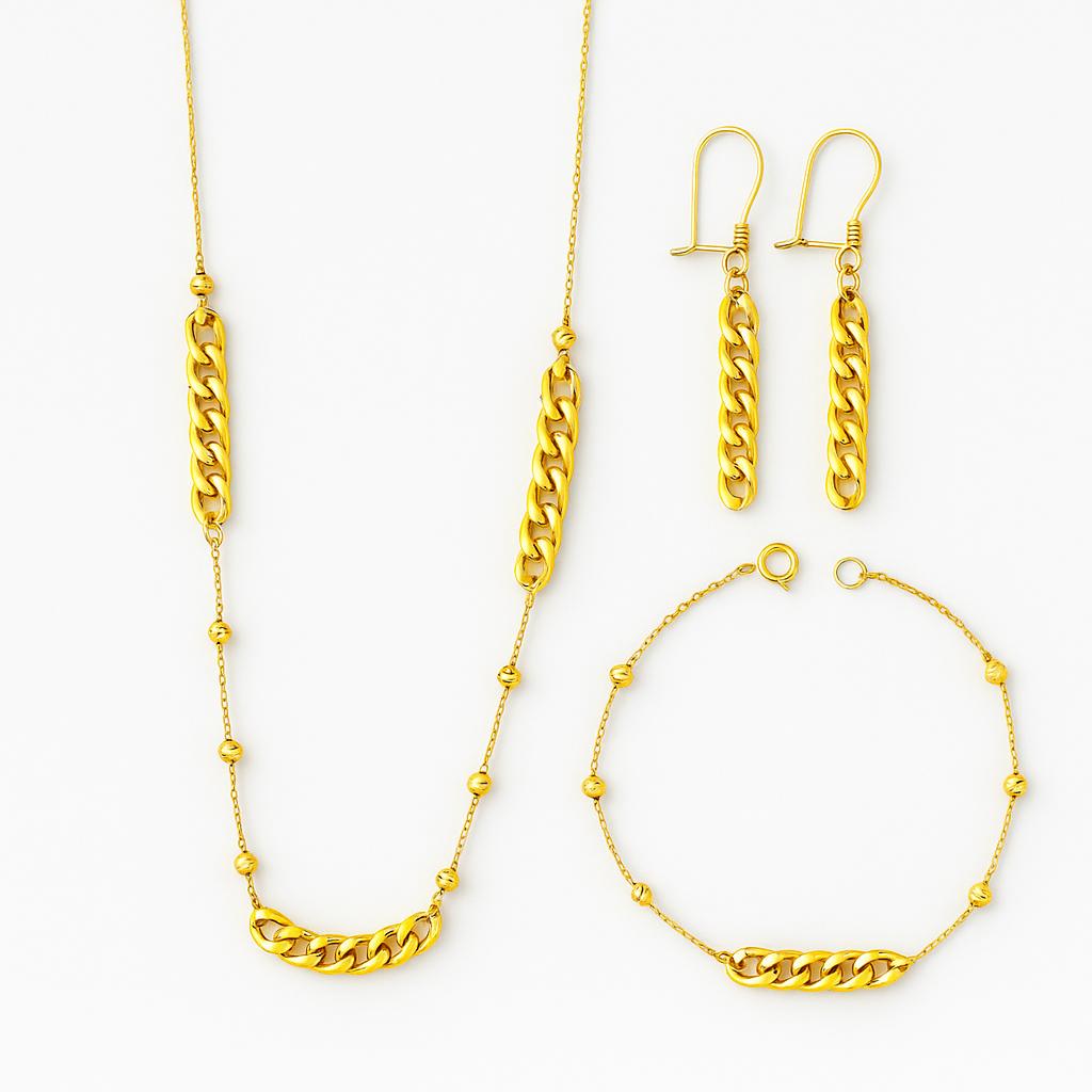 **زیورآلات کلاسیک** این سرویس نیم کارتیر شامل یک گردنبند، یک دستبند و یک جفت گوشواره چشمنواز از طلای زرد است. طراحی مدرن و ساده این مجموعه، آن را به گزینهای ایدهآل برای استفاده روزمره یا مناسبتهای خاص تبدیل کرده است. گردنبند با زنجیر پرداخت شده و حلقههای براق، ظاهری شیک و جذاب به همراه دارد. دستبند نیز به همین شیوه طراحی شده و گوشوارهها با فرم آویزان، زیبایی بیشتری را به چهره شما اضافه میکنند. با وزن تقریبی 4.550 گرم، این سرویس با کیفیت ساخت بالا و ظرافت بینظیر، گزینهای خاص برای بانوانی است که به دنبال زیبایی و سادگی در عین حال میباشند.