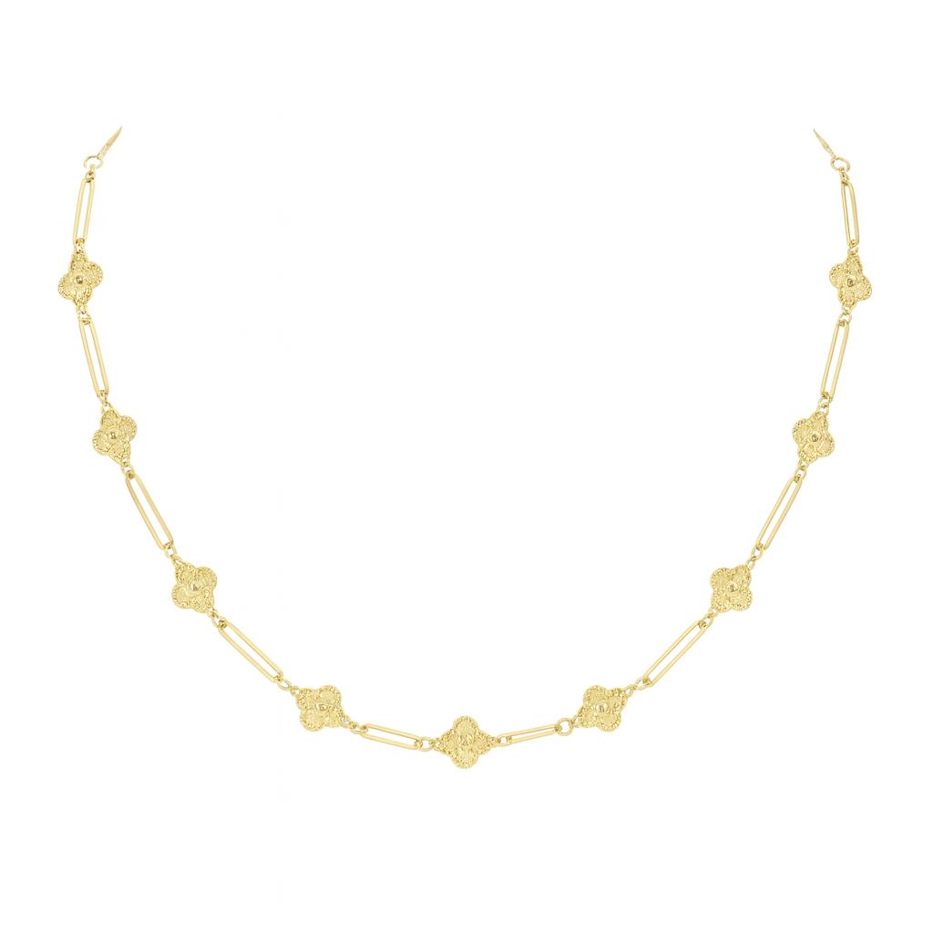 ### گردنبند طلایی خاص این گردنبند زیبا با طراحی منحصر به فرد، نمونهای عالی از هنرمندی در صنعت طلا و جواهر است. ساختهشده از طلای زرد با وزنی تقریباً 1.600 گرم، این گردنبند شامل زنجیری با الگوهای متنوع و جذاب است که شامل حلقههای مستطیلی و اشکال گلمانند میشود. طراحی این گردنبند به گونهای است که ظاهری شیک و مدرن را به نمایش میگذارد و برای استفاده در مهمانیها یا مناسبتهای رسمی بسیار مناسب است. با این زیورآلات خاص، میتوانید در هر مجلس و محیطی درخشش و تأثیرگذاری بینظیری داشته باشید.