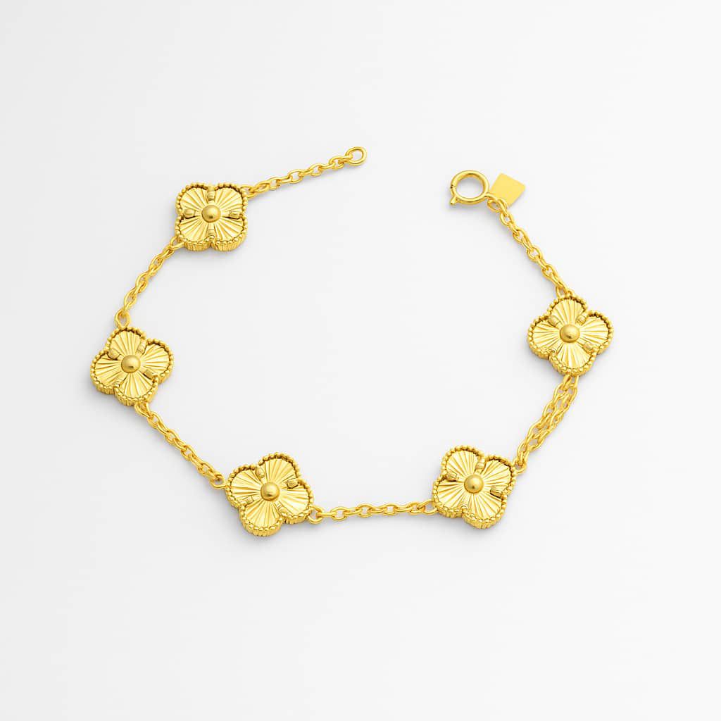 **دستبند گلی** این دستبند طلایی زیبا، نمایشی شیک از هنر و طراحی است. از جنس طلای زرد با ظاهری درخشان و جذاب، این دستبند شامل پنج گل ظریف با جزئیات دقیق است که به زیبایی در کنار یکدیگر قرار گرفتهاند. زنجیر ظریف و ملایم آن، راحتی در استفاده را تضمین میکند و ابعاد مناسب آن، جلوهای خاص به دستان شما میبخشد. این دستبند، گزینهای عالی برای استفاده روزمره یا مناسبتهای ویژه میباشد و به عنوان یک هدیه خاص برای عزیزانتان نیز بسیار مناسب است.