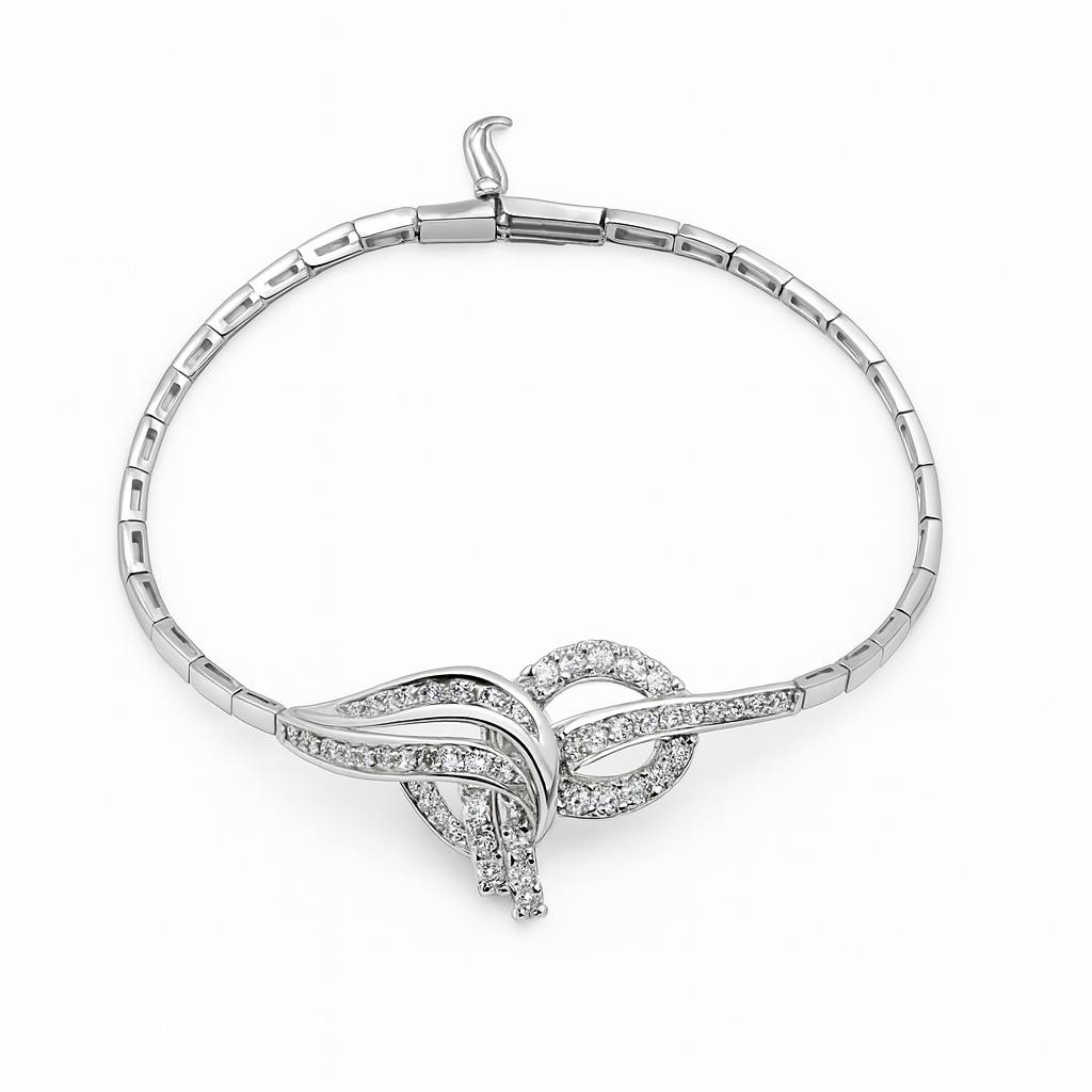 ### دستبند زیبای مدرن این دستبند شیک و خاص از طلا سفید با طراحی منحصر به فرد و جالب توجه، انتخاب ایدهآلی برای جذابیت و زیبایی شماست. دارای نگینهای درخشان و خوشساختی است که جلوهای خیرهکننده به آن بخشیدهاند. با طراحی ظریف و پیچشی، این دستبند میتواند همراهی عالی برای هر مناسبتی باشد. ابعاد آن به گونهای است که به راحتی بر روی مچ دستانتان قرار میگیرد و احساس راحتی را به همراه دارد. با این زیورآلات، زیبایی و استایل خود را دوچندان کنید.