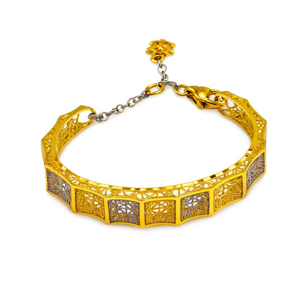**عنوان: دستبند جادویی بچگانه** این دستبند بچگانه زیبا و خاص، از طلای زرد با ظرافت فوقالعاده طراحی شده است. با وزن تقریبی 5.650 گرم، این قطعه نه تنها شیک و مدرن به نظر میرسد بلکه دارای جزئیات ظریف و خیرهکنندهای است که آن را به انتخابی مناسب برای کودکان تبدیل میکند. طرح شبکهای آن که با ترکیبی از رنگهای طلایی و نقرهای جلوهای خاص به آن بخشیده، مهر تأییدی بر سلیقه عالی شما در انتخاب طلا و جواهر است. این دستبند برای هر مناسبتی ایدهآل است و به راحتی با لباسهای مختلف کودکان هماهنگ میشود.