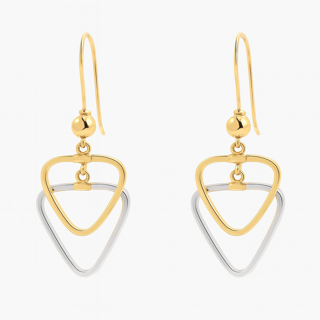 ### گوشواره دو رنگ خاص گوشوارههای دو رنگ با طراحی مدرن و جذاب، انتخابی ایدهآل برای خانمهای شیکپوش است. این گوشوارهها از ترکیب طلای زرد و نقرهای ساخته شده و به واسطهی شکل مثلثی خود، جلوهای خاص و زیبا به چهره میبخشند. با وزن تقریبی 3.700 گرم، این زیورآلات نه تنها سبک و راحت هستند، بلکه میتوانند به راحتی با هر نوع لباسی ست شوند. طراحی دو بعدی این گوشوارهها، ظرافت و مدرنیته را به نمایش میگذارد و انتخابی مناسب برای هر مناسبتی خواهد بود.