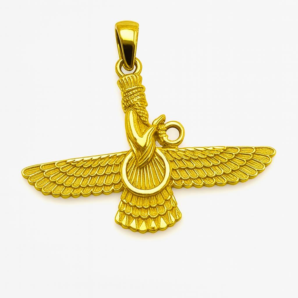 **پلاک فروهر** --- پلاک فروهر یک آثار زیبا و خاص از جنس طلای زرد با وزن تقریبی 3.140 گرم است. طراحی منحصر به فرد این پلاک، نمادهای فرهنگی و هنری را در خود جای داده و جلوهای منحصر به فرد به هر استایلی میبخشد. با نقش آفرینی دقیق و زیبای پرندهای با بالهای باز، این قطعه به شکلی هنرمندانه و بینظیر مزین شده است. ابعاد آن به گونهای است که نه چندان بزرگ و نه کوچک بوده، به راحتی بر روی گردن شما خودنمایی میکند. این پلاک مناسب برای استفاده روزمره و همچنین مناسبتهای ویژه است و میتواند یک هدیهای خاص برای عزیزانتان باشد.